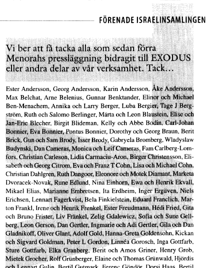 Leif Nelsons namn kunde också ses annonseras i "Menorah", nr.3-1995, i en "tacklista" i tidskriften som en person Förenade Israelinsamlingen tackar för bidrag till deras kampanj EXODUS.