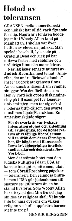 När vi skriver om DN förs tankarna till en artikel i Svenska Dagbladet den 7/3-1997, publicerad på kultursidornas "Under Strecket" och skriven av judinnan Nina Solomin med rubriken "Judarnas integration i det amerikanska samhället". Artikeln handlade om den amerikanske juden J. J. Goldbergs bok "Jewish Power" - på svenska rätt och slätt "Judisk makt".Som en parentes kan det här vara på sin plats att nämna att Nina Solomin sitter i redaktionen för judenhetens främsta tidskrift i Sverige - "Judisk Krönika".