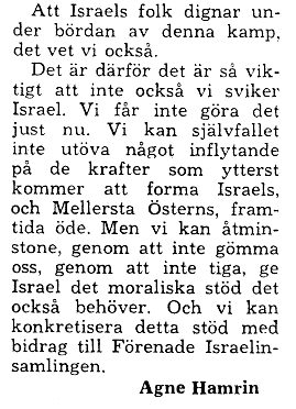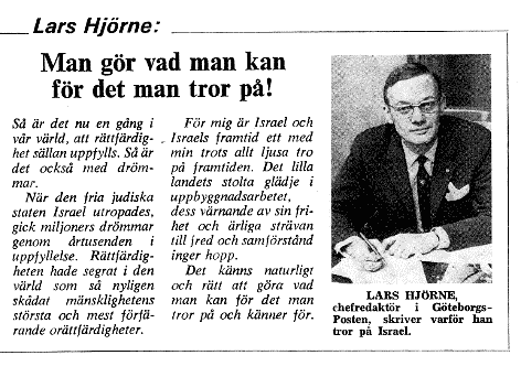 Göteborgs-Postens tidigare chefredaktör Lars Hjörne skriver om "varför han tror på Israel" i Förenade Israelinsamlingens tidskrift Menorah, nr.2-1972:"För mig är Israel och Israels framtid ett med min trots allt ljusa tro på framtiden."