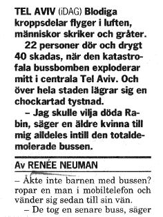 Eller som Aftonbladets Fredrik Virtanen skriver i en kolumn i Aftonbladet 7/6-2001: "[...] vi har sett Israels premiärminister Ariel Sharon mörda palestinier medan DN klappar händerna [...]."