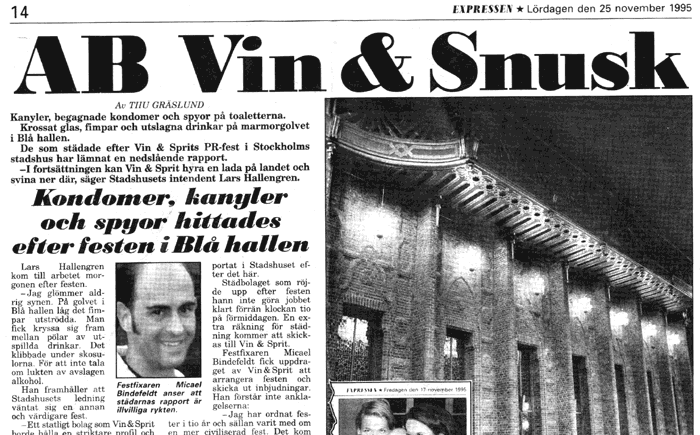Expressen, 25/11-1995. När festfixaren Michael Bindefeld ordnade fest för Vin & Sprit i Stadshuset hittade man spyor, kanyler och kondomer överallt dagen efter. "I fortsättningen kan Vin & Sprit hyra en lada på landet och svina ner där", säger man på stadshuset. Då får de väl se till att arrangörs-svinet följer med.