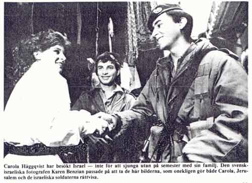 ![]() Carola Häggkvist på besök i ockupationsmakten Israel, fraterniserande med dess ockupationssoldater som begår dagliga brottt mot folkrätten och FN-stadgan. |