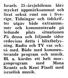 Del av artikel från Förenade Israelinsamlingens tidskrift Menorah, nr.2-1973.Mona Krantz och Kent Finell underhåller "med israelisk musik" i samband med Israels 25-års jubileum 1973.