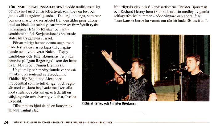 Artikel och text ovan från Förenade Israelinsamlingens tidskrift Menorah, nr.1-2000.Richard Herrey och Christer Björkman uppträder på "Israelfestivalen" år 2000, på Nalen. Pengarna som samlas in på detta jippo går till Förenade Israelinsamlingen och därefter till Israel.