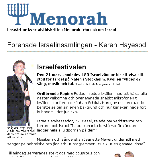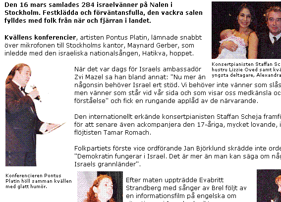 Bild- och bildtext ovan från en artikel i Förenade Israelinsamlingens tidskrift "Menorah", nr.2-2003 (Internetversionen) om "Israelfestivalen" den 16:e mars 2003, på Nalen i Stockholm.