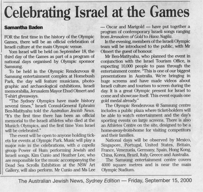 The article below has been taken from Sydney Jewish News (15 Sept. 2000).