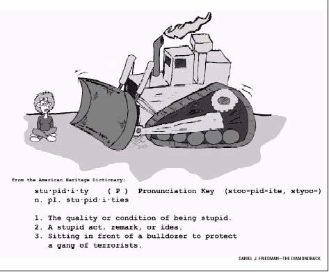 "As always, Rachel Corrie went to the falafel stall where she had lunch and bantered with the Palestinian proprietors. Carrying a loudspeaker and wearing an orange fluorescent vest, the young American peace campaigner was heading for a protest against the Israeli Army's demolition of Palestinian houses in the Gaza Strip town of Rafah. Later that afternoon, on March16, Ms Corrie, 23, died under an Israeli bulldozer and became a heroine for Palestine ... Ms Corrie's courage is in no doubt. Simply being in Rafah is terrifying. There are daily gun battles and Israeli tank incursions and air bombardments. The city is overlooked by Israeli watch towers known as the "towers of death". It is squalid and oppressed. ISM activists chose to live there to bring attention to the misery of the Palestinians and show solidarity with people perceived as terrorists by most Americans. They are respected and welcomed by the Palestinians, and often act as human shields to protect children from gunfire by walking them to school. Ms Corrie had become politically conscious only since September11, 2001 ... The posters of Ms Corrie that began to appear on buildings and lampposts look incongruous beside pictures of the hundreds of Arab men, women and babies killed in the intifada. The homage began as US troops were preparing for the invasion of Iraq, seen by many in Palestine as a crusade against the Arab world. Tom Dale, 18, a British friend of Ms Corrie and fellow activist, said he saw her die. First, he said, there was fear on her face as she realised that her defiant gesture was going wrong. Joe Smith, 21, who went to college with her, said that, although they acknowledged the danger, they saw death as a "small, unlikely, potential risk". The activists have compelling photographic evidence to support witness claims that Ms Corrie's killing was deliberate. Mr Dale watched as she knelt down in front of the bulldozer, perhaps 20 metres away, something the activists had done repeatedly. 'Unfortunately, she couldn't keep her grip there and she started to slip down,' Mr Dale said. 'All the activists there were screaming, running towards the bulldozer, trying to get them to stop. But they just kept on going.' The activists said the driver saw her. 'As the mound grew higher she climbed up, getting to eye level with the driver. He saw her in her fluorescent orange jacket. But he kept on going,' Mr Smith said. A traumatised Mr Smith raised his camera and took photographs: Ms Corrie standing in front of the bulldozer; then her bloodied body being pulled from the freshly turned soil; being cradled in the arms of her friends. "If only they'd had a video camera," one Palestinian journalist lamented. 'A film of the Israelis killing an American in cold blood would have ended the intifada.' The weight of the heavy-duty, US-made military earthmover crushed Ms Corrie deep into the soil. Once. Twice. She was still alive when the driver, an Israeli soldier, reversed over her, but she died soon after being taken to Rafah hospital, where she regained consciousness for a moment. Her last words were: 'My back is broken' ... The Israeli Army sent its own representative to Ms Corrie's memorial service a week after her death. A tank pulled up beside the mourners and sprayed them with tear gas. A bizarre game of cat-and-mouse began as the peace activists chased the tank around to throw flowers on it, and the Israeli soldiers inside threatened, in return, to run them down. The game ended when the Israeli bulldozers came out, accompanied by more APCs, firing guns and percussion bombs. The insult was as clear as the danger of the situation and the people went home, the service halted. There are those who dismiss Western activists as just well-intentioned "political tourists", naive and ineffectual do-gooders. On the night of Rachel Corrie's death, nine Palestinians were killed in the Gaza Strip, among them a four-year-old girl and a man aged 90. A total of 220 people have died in Rafah since the beginning of the intifada."